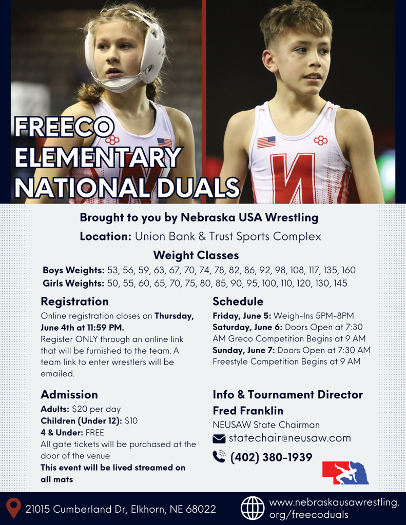 Register ONLY through an online link that will be furnished to the team. We will be using the USAW National registration and bracketing system for teams and rosters, just like 14u, 16u and Junior duals.