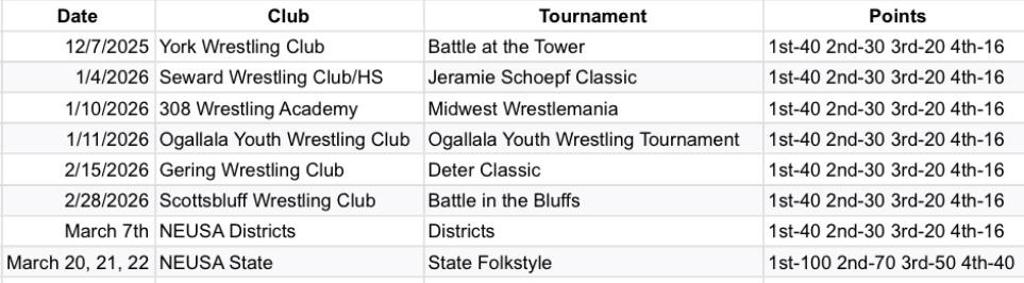 Tour of Nebraska place winners. Our Tour points are updated and posted for viewing after each Tour weekend. Please look and ensure your wrestler got the points they deserve. You can contact us with questions.